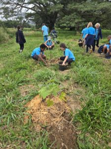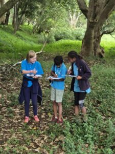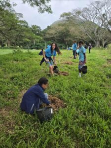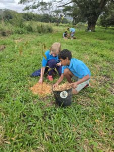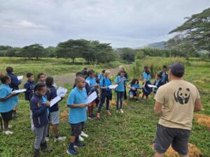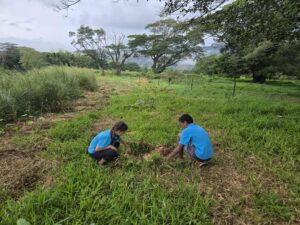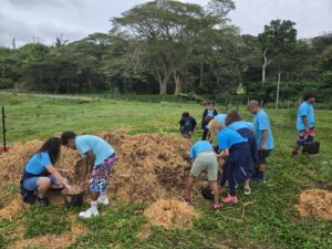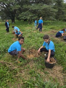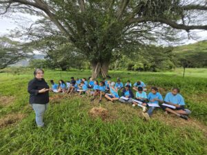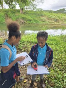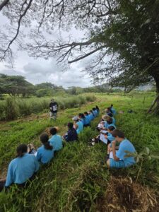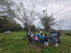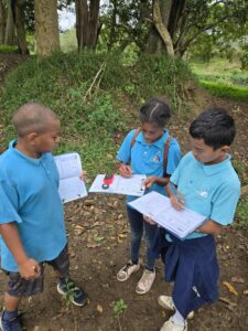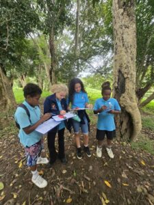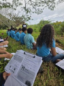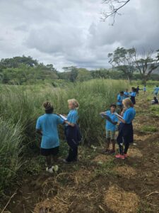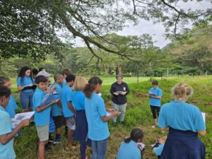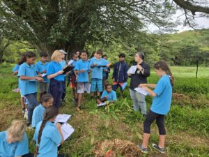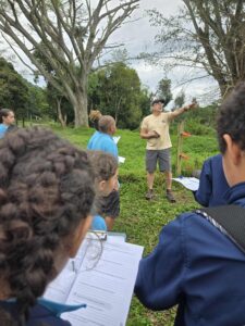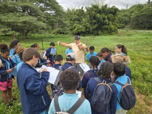 Les élèves ont pu profiter du partage avec nos deux partenaires. Pour commencer avec Hubert de WWF Antenne Nouvelle-Calédonie qui a pu faire l’historique de la propriété et partager ses connaissances et son engagement avec les élèves. Le groupe a participé au chantier de plantation sur place en réalisant le paillage d’une petite partie des 400 arbres plantés dans le cadre du projet PERENNE. La matinée s’est poursuivie avec l’expertise de Fabienne Bourdeau du Centre d’initiation à l’environnement pour approfondir les observations et les enrichissements sur l’intérêt de protéger tous les écosystèmes.